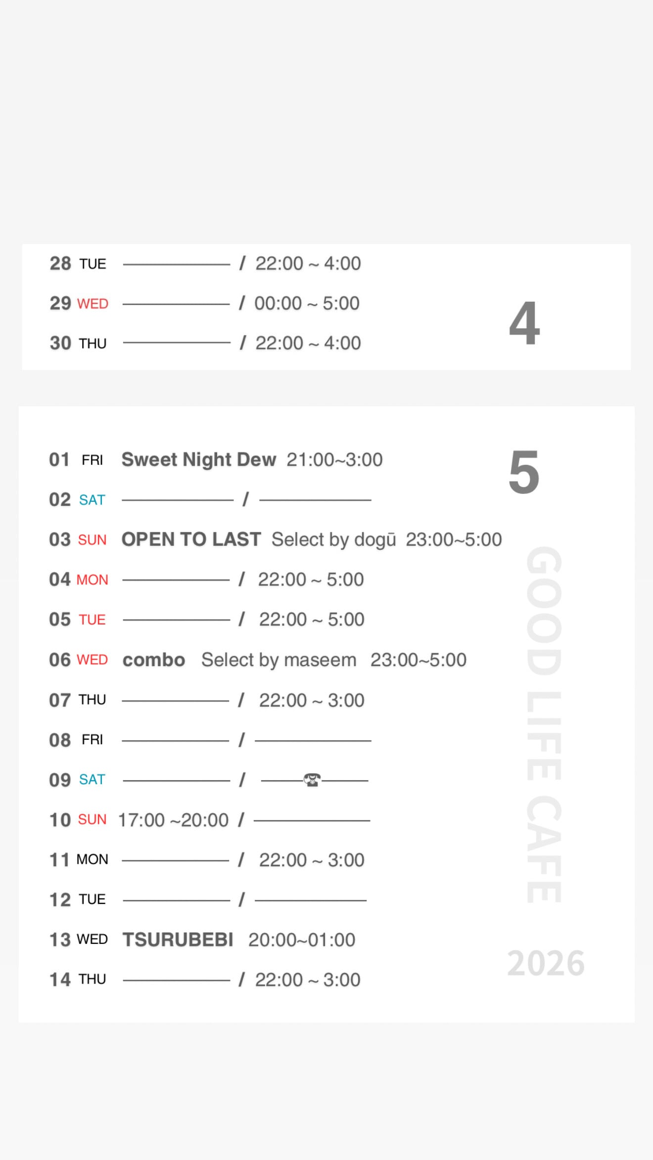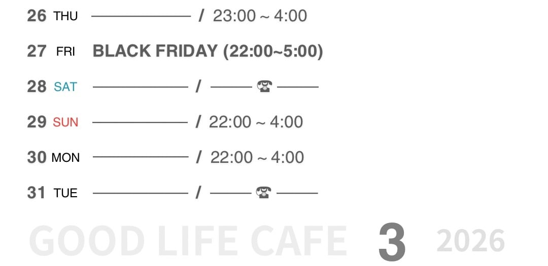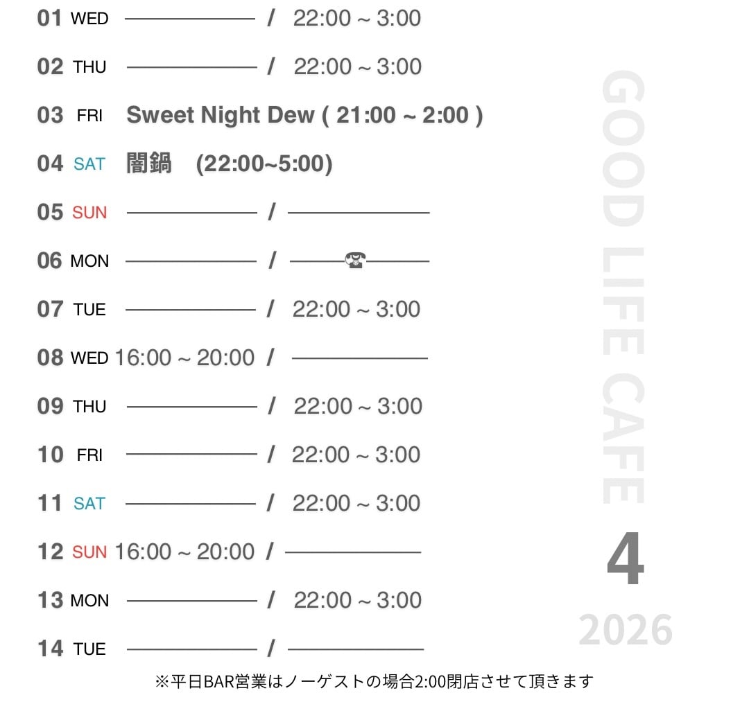 ※平日BAR営業は5:00まででも深夜2:00時までノーゲストの場合閉店させていただきます。
